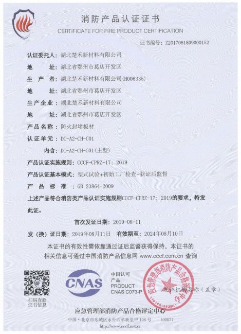 防火封堵板材(CH-C01)3C認證證書